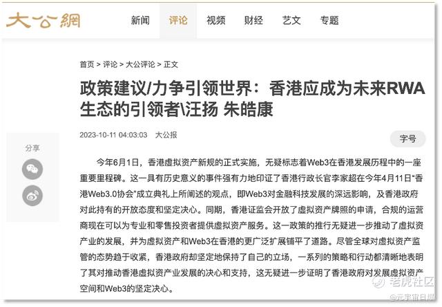 在大公报上,香港科技大学副校长、香港 Web3.0 协会首席科学顾问汪扬、香港理工大学金融科技博士生朱皓康在联名发起的政策建议中表示,香港在虚拟资产和Web3领域的发展主要集中在合规和牌照上,还未着重于构建充满活力的生态系统。