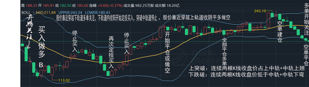 当股价靠近穿越上轨道的时候开始警戒,收阴线卖出一部分,当股价跌破中轨道一次平仓。再重复以上准备,定投买入做多的循环。