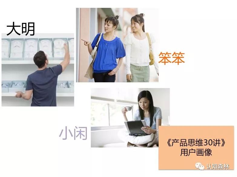 这里分析使用的是梁宁老师《产品思维30讲》里介绍的一套用户画像,这套画像将用户分为了大明、笨笨和小闲三类用户: