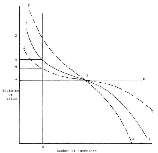 米勒认为,在卖空约束下,股价高估的程度与投资者观点的分歧程度呈正相关,前面的例子,如果投资者的分歧不是95-105,而是85-115,那么最终的成交价可能就是115元,高估了15%而不是5%。