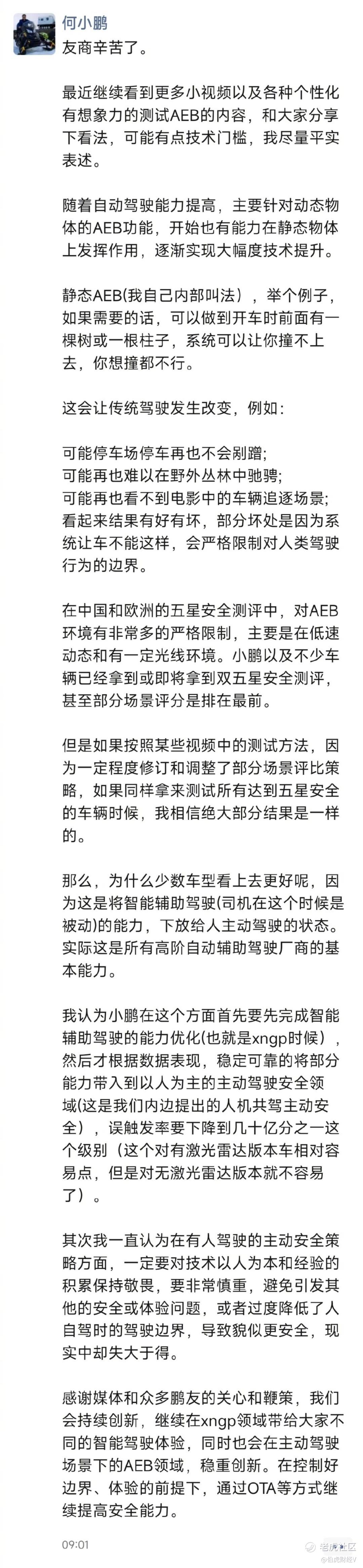 持相反观点的人还不少。何小鹏今早就在微博给出了回应。何小鹏的核心观点是:首先高速AEB存在安全隐患和体验的问题,当前要做的是优化智能辅助驾驶能力,降低误触率;其次在有人驾驶的主动安全策略方面,要更加谨慎。