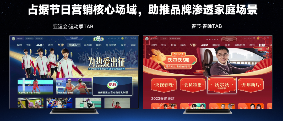 比如,沃尔沃曾在春节期间选择通过OTT+的方式以此强化品牌印象,基于春节氛围,春节频道仅4天就为沃尔沃整体带来超16亿曝光;伊利在亚运会期间同样借助OTT的大屏优势以及浓厚的体育氛围,总曝光完成率达104.39%,用情绪价值领跑同行……