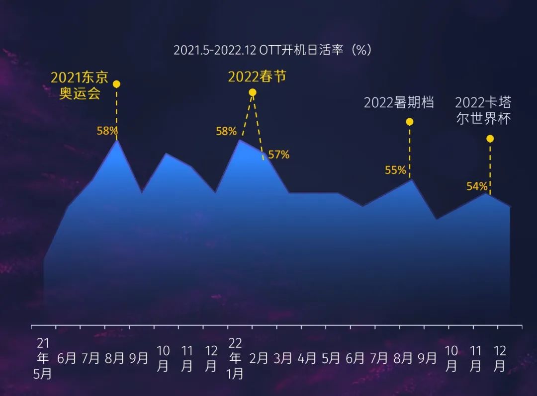 拿2022年春节为例来看,据《2022智能家庭大屏营销30问》数据显示,春节期间电视使用频率提升26.3%,每天使用电视的用户比例提升80%,有近70%用户首选“用电视看春晚”,同时春节期间电视的日活率能够达到58%左右。
