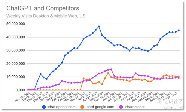 根据OpenAI最新披露的数据,自去年11月上线至今,已有200万开发者参与到ChatGPT的生态建设中,周活跃用户已达1亿。与此同时,OpenAI还借ChatGPT拉来了C端流量,该对话机器人的10月份全球访问量仍在17亿次,居各种AI应用之首。