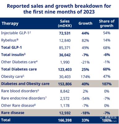 从业绩上来看,诺和诺德的业绩增长也是相当稳健。第三季度,诺和诺德营收758.08亿丹麦克朗,约合107.64亿美元,同比增长37%。前三季度诺和诺总销售额1663.98亿丹麦克朗,约241.52亿美元,同比增长29%。其中,糖尿病和肥胖护理业务收入1538.06亿丹麦克朗,约合223.42亿美元,同比增长36%。