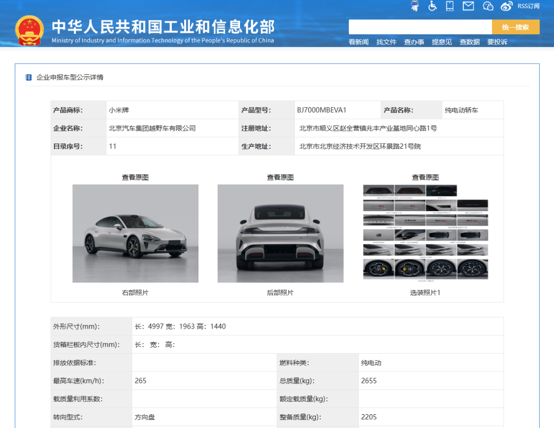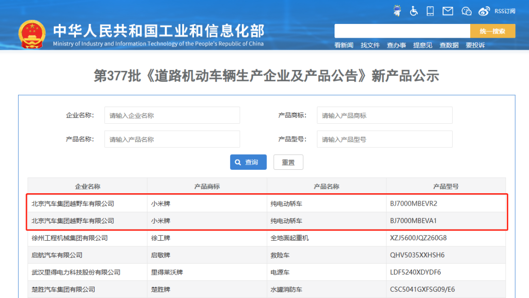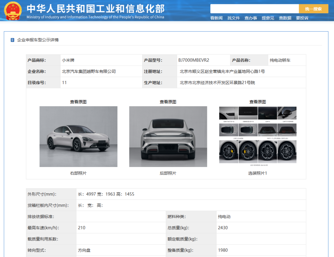 本次新产品公示中,“小米牌”汽车共有2款,均为纯电动轿车,型号分别为BJ7000MBEVA1和BJ7000MBEVR2,企业名称为北京汽车集团越野车有限公司。