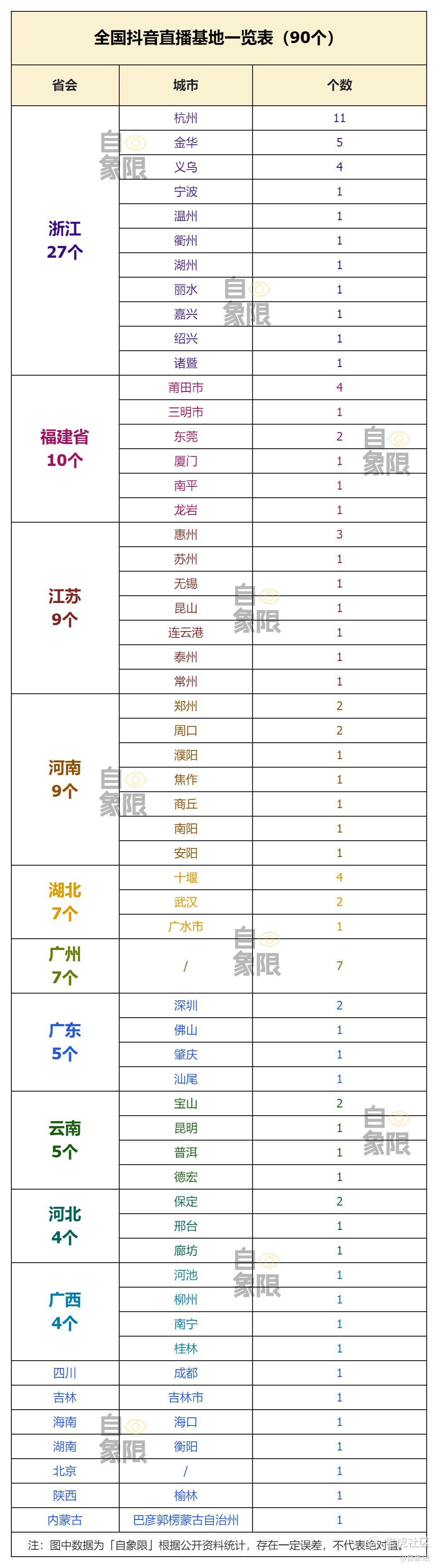 「自象限」根据抖音官方、各地政府文件等公开信息统计,目前全国抖音直播基地约90个,集中在长三角一带,浙江省共27个,福建省10个、江苏省9个,排在前三名。