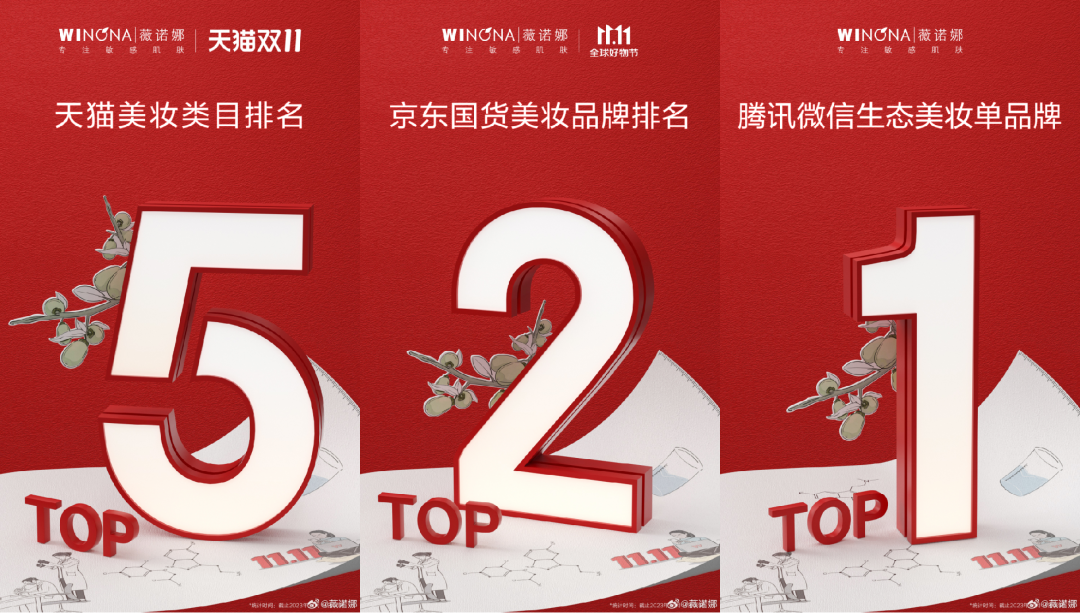此外,专注于敏感肌赛道的薇诺娜也强劲发力,迎来了完美收官。数据显示,截止到2023年11月11日24时,薇诺娜成功跻身天猫美妆行业Top10,并进阶提升至天猫美容护肤类目Top5,取得历史最佳品牌名次,成为2017-2023年连续7年入围该榜单前十的中国品牌。