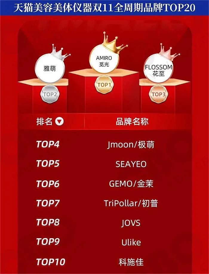 除了化妆品,今年双11,美容仪也成为了一个新的爆火品类。国产品牌觅光夺冠,极萌、花至、JOVS等国货新锐进入TOP10,一直爆火的Ulike也稳居前十。本届双11,美容仪品类可谓是“杀疯了”,这其中,表现亮眼的依然是国货品牌。