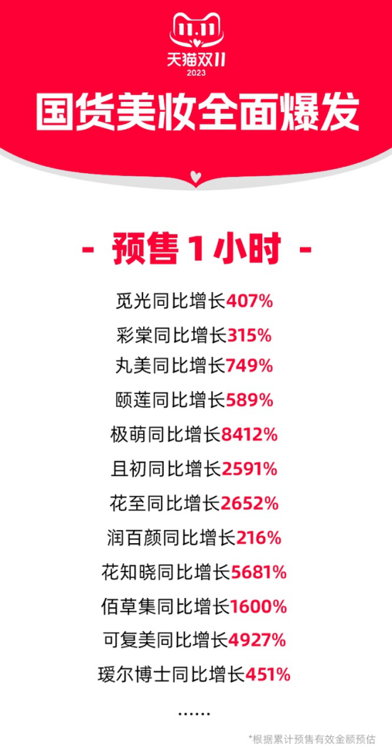 天猫预售开启一小时内,珀莱雅红宝石面霜3.0就卖出了超过50万件,逐本卸妆油卖出超过40万件,珀莱雅“早C晚A”组合双抗精华卖出超过30万件,且初同比增长2591%,颐莲同比增长589%;美容仪品类,极萌同比增长超8412%,觅光同比增长407%……