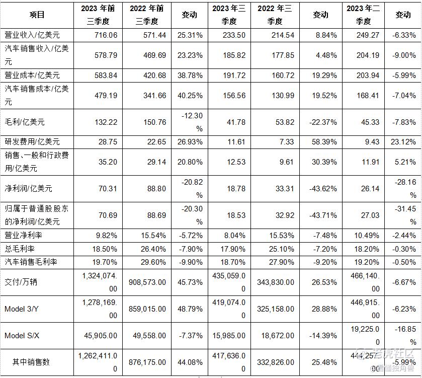 从营收来看,截至9月底,特斯拉前三季度的总营收为716.06亿美元,同比增长25%;第三季度的总营收为233.50亿美元,同比增长9%,环比下降6%,其中汽车销售收入为185.82亿美元,同比增长4%,环比下降9%,出现了负增长,第三季度营收增长未达市场预期,给四季度带来了不小的业绩压力。从交付量来看,前三季度汽车销售的交付量同比上涨44%,第三季度交付量同比上涨25%,环比下降6%。上述数据显示,特斯拉营收同比的涨幅明显小于交付量的涨幅,可见汽车的平均单价在下降,特斯拉通过降价策略实现规模化,但交付量环比下降说明通过降价实现的规模化效应在逐渐减弱。