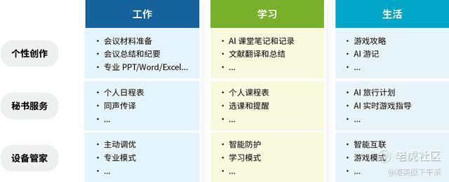 通用场景下的个性化服务,是指AI PC能够针对工作、学习、生活等场景,提供个性化创作服务、私人秘书服务、设备管家服务在内的个性化服务。