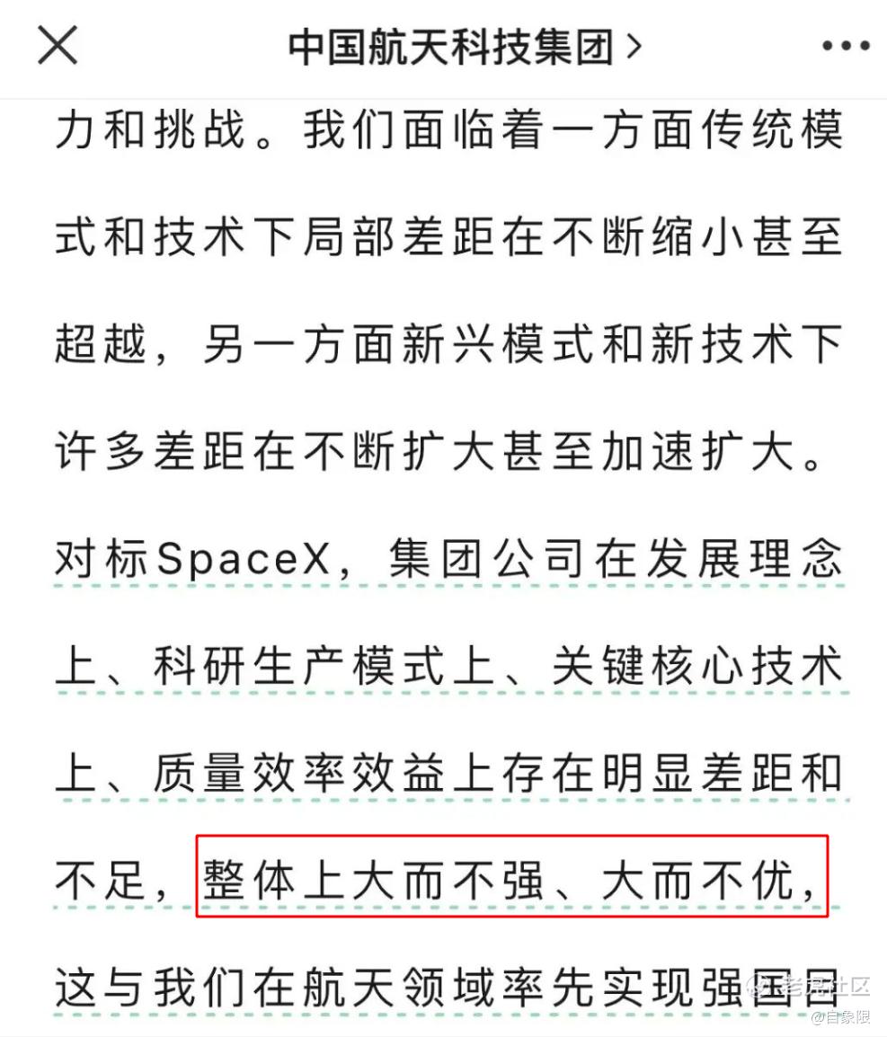 大而不强,是中国航天科技集团对自己的评价,而对标SpaceX则是其知耻而后勇的表现,当一个本就优秀的人愿意放下姿态,躬身学习的时候,我们其实更能够遇见其今后的发展潜力 。