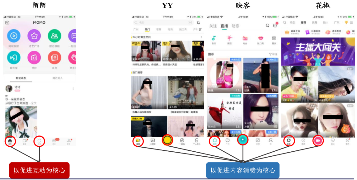陌陌的“首页帧”是“附近动态”和“附近的人”,“中心帧”是“消息”,也就是 聊天界面;其他直播平台的“首页帧”是直播内容推荐,“中心帧”是内容发布按钮。从产品逻辑角度出发,陌陌希望用户进行互动、达成社交关系,而其他直播 平台希望用户发布、消费内容。