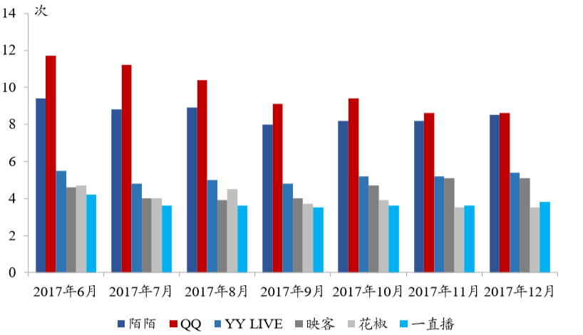 从用户使用行为上同样可以验证这一点。“人均单日启动次数”代表着用户打开 App 的频率,对于社交产品来说,用户需要频繁打开 App 进行消息的收发操作, 而直播平台并不需要。在这一数值上,陌陌与 QQ 接近,远高于其他直播平台。