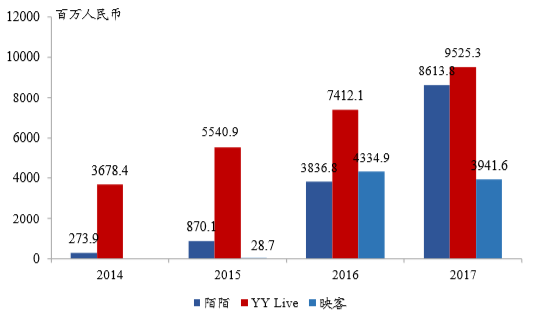 陌陌于 2016 年 4 月正式全面开放直播,虽比起其他娱乐直播平台推出时间较晚, 但背靠其彼时 7000 万 MAU 的流量支持迅速发展壮大,跻身娱乐直播行业第一梯 队。2017 年,陌陌直播业务营收 72 亿人民币,仅次于 YY Live 的 86 亿;总营收 86 亿人民币,仅次于 YY Live 的 95 亿,遥遥领先行业第二梯队