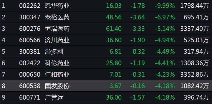 港股的中国生物制药跌超过14%,康哲药业跌超12%,石药集团跌9.7%,复星医药和三生制药跌超过7%。