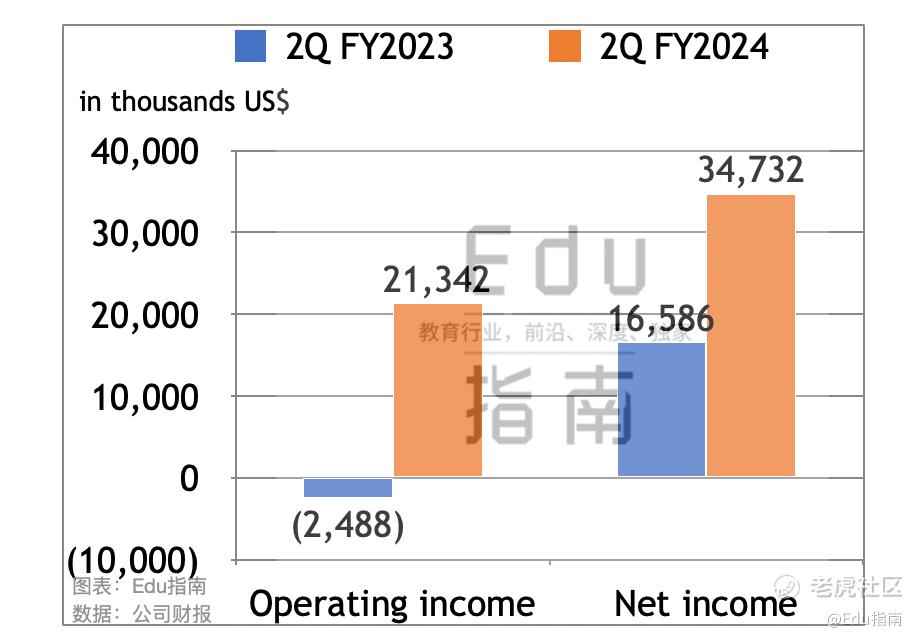 从上半财年来看,新东方公司2024财年上半年经营利润为2.3亿美元,相较上一财年同期的7550万美元,该利润增幅为200%。本财年上半年该公司净利润为2.1亿美元,上一财年同期为1.0亿美元,本期净利润增幅为108%。