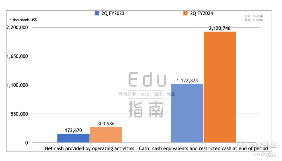 根据季报,新东方公司本财年二季度经营活动现金净流入额为3.0亿美元,上一财年该项净流入1.7亿美元,本季度该项现金净流入增幅为73%。截至本财季末,该公司拥有现金、现金等价物及受限现金额为21.2亿美元,相较上一财年同期的11.2亿美元,该项现金资产增幅为89%。