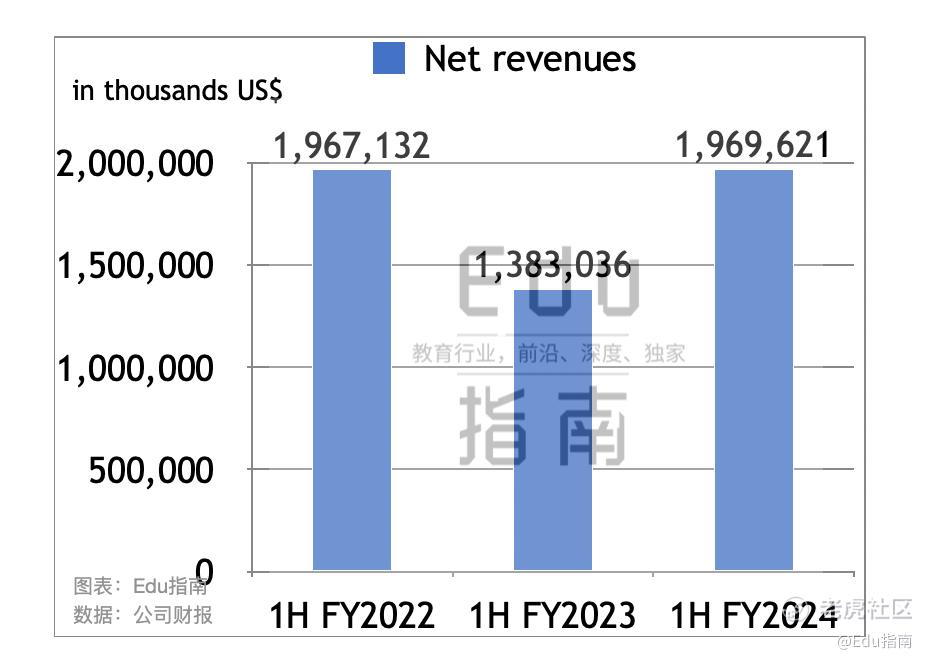从2024财年上半年两个季度来看,新东方公司收入为19.7亿美元,相较2023财年上半年的13.8亿美元,本财年上半年收入增长42%。该公司2023财年上半年相较2022财年同期表现为收入减少30%。本期收入由下降转为增长。