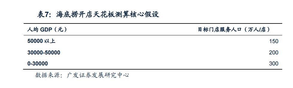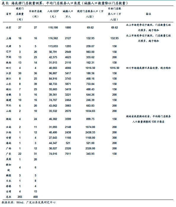 根据广发证券在今年一月份的报告里的测算,海底捞长期的开店空间在468间左右。其假设如下,另外北京、上海由于竞争激烈,同时四川和重庆是饮食高地,都几乎不具有开店空间。
