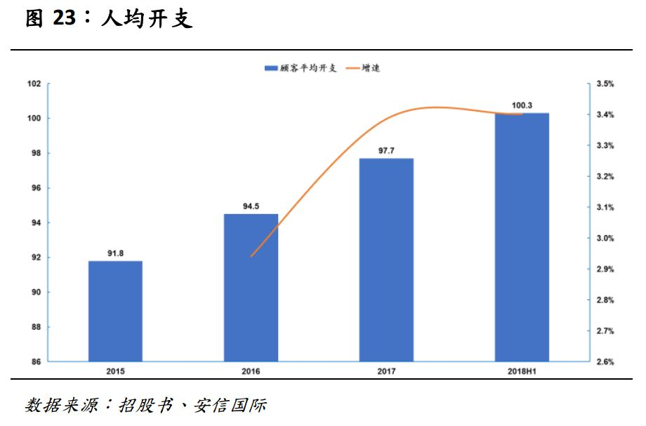 而增长的另一端是顾客的人均开支增长,最近一年多增速维持在3%以上,绝对值在100左右。平均开支未来还有继续增长的空间,但是随着它越来越贵增长也会受限,增速也会逐渐贴合通胀水平。
