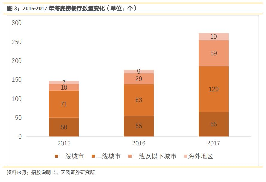 接下来看门店数量。海底捞这么猛烈的扩张速度,哪里才是它增长的边界呢?从门店结构上看,新增部分主要来自于二三线城市。进入到新的市场会有不小挑战。简单讲,从一线城市的情况看海底捞是存在一个它觉得比较合适的密度的,密度太大就会各个门店之间自我竞争。