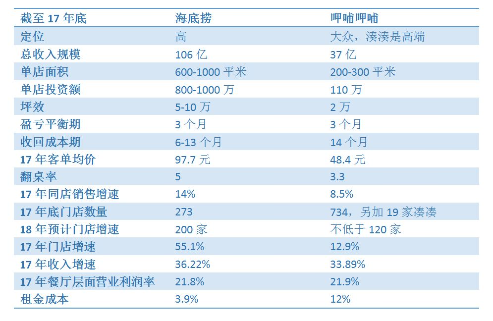我们用17年的数据进行比较。直观感受,海底捞定位高端,人均消费较高,占地面积更大。由于海底捞面积大,具有更强的引流效果,和业主的议价能力更强,因此它的单位租金较低。呷哺呷哺按照翻台率这个指标计算有点吃亏,是因为呷哺仍有不少是餐台式的,适合单人就餐,并不是其他很多餐厅那种容纳四个人的餐台。如果要横向对比,可以认为呷哺呷哺的是“翻座率”,除以2/3才是一般的翻台率。如果这样计算后,呷哺呷哺和海底捞的翻台率差不多,都是5,是很高的水准。翻台率这个指标是计算餐饮公司常用的营业指标,海底捞和呷哺呷哺各有拿手好戏。海底捞是通过延长营业时间,甚至24小时营业的来提高,而呷哺呷哺是用快餐式的高周转率来提高翻台率的。