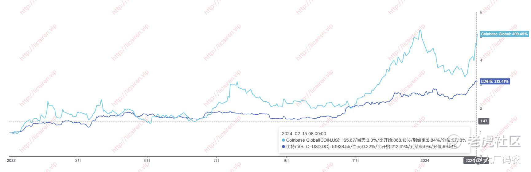 从下图比特币和coinbase的价格走势来看,大多数情况下coinbase表现都比比特币要好,但是coinbase波动更大,所以持仓coinbase的得心态好,控制好仓位