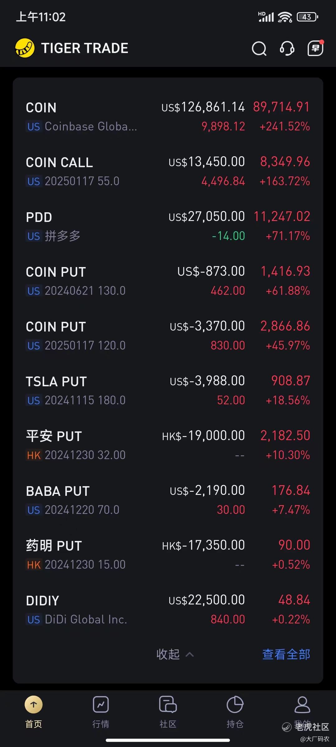 目前持仓只有一个谷歌的PUT是小亏的,其它当前都是红的,最近一周中概包括港股科技都涨势不错,滴滴也终于水上了