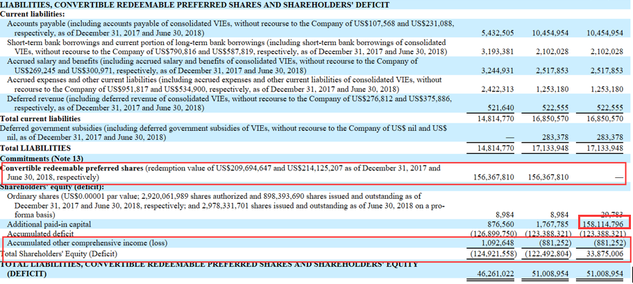 公司在本次发行前主要通过可转换可赎回优先股筹措资金,共形成1.56亿美元的夹层资本(负债)。2018年6月以后公司将这些优先股全部转换为普通股,形成了1.58亿美元的股本计入所有者权益。冲减后公司的所有者权益变为正的3387.5万。公司营收