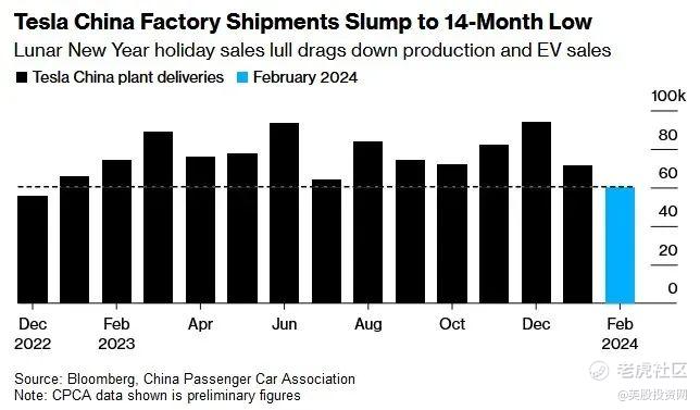 今天特斯拉暴跌8%,原因是在春节假期销售低迷、以及电动汽车市场价格战加剧的影响,特斯拉(TSLA)中国2月批发销量降至一年多以来的最低水平。中国乘联会周一公布的初步数据显示,特斯拉中国2月批发销量为60365辆,这是2022年12月以来的最低水平,环比降幅接近16%;同比降幅更大,达到19%。