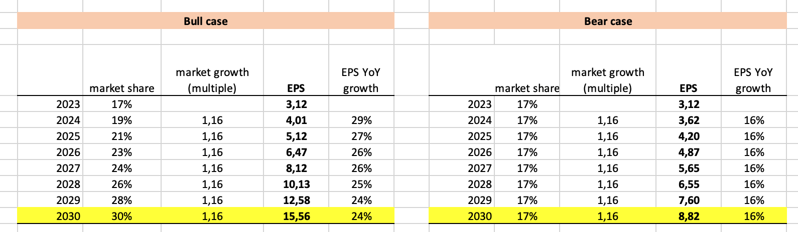 2023年汽车部门实际上创造了3.12美元的每股收益,假设电动车市场未来10年复合年增长率16%,我们预测2030年特斯拉每股收益上升到15.5美元(这相当于每股收益每年增长25-30% )