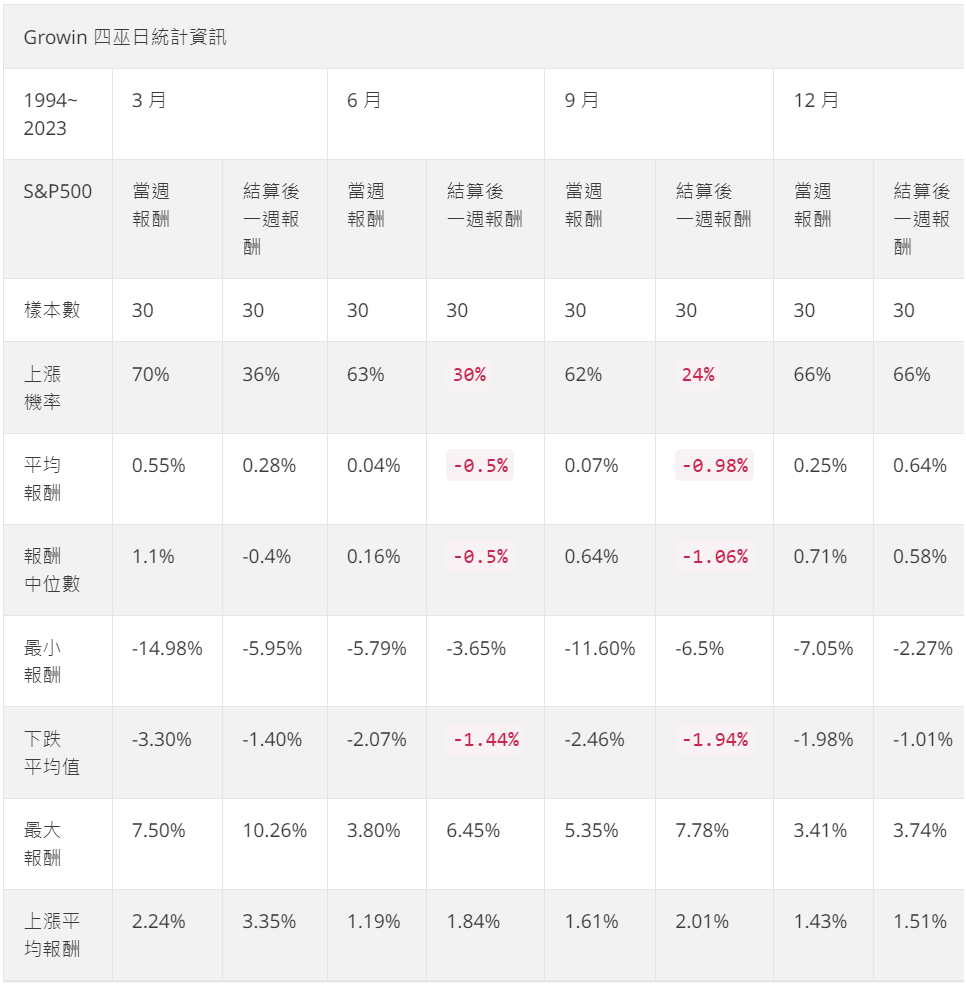 根据上图的数据,我们可以明显看出,每年的三月、六月和九月,四巫日对其后一周的市场走势具有较为明显的负面影响。在这些月份,市场下跌的概率高达六成至七成,这意味著这些时期内的投资者面临著相对较大的风险。而当市场确实下跌时,平均跌幅维持在1.4%至1.9%的范围内。然而,值得注意的是,到了每年的十二月,情况却恰恰相反。在这个月份,四巫日后的一周,股市往往表现出相对较好的走势,这可能意味著投资者在这个时期可以期待一定的收益。这一现象揭示了四巫日对市场的影响在不同季节之间存在著显著的差异。