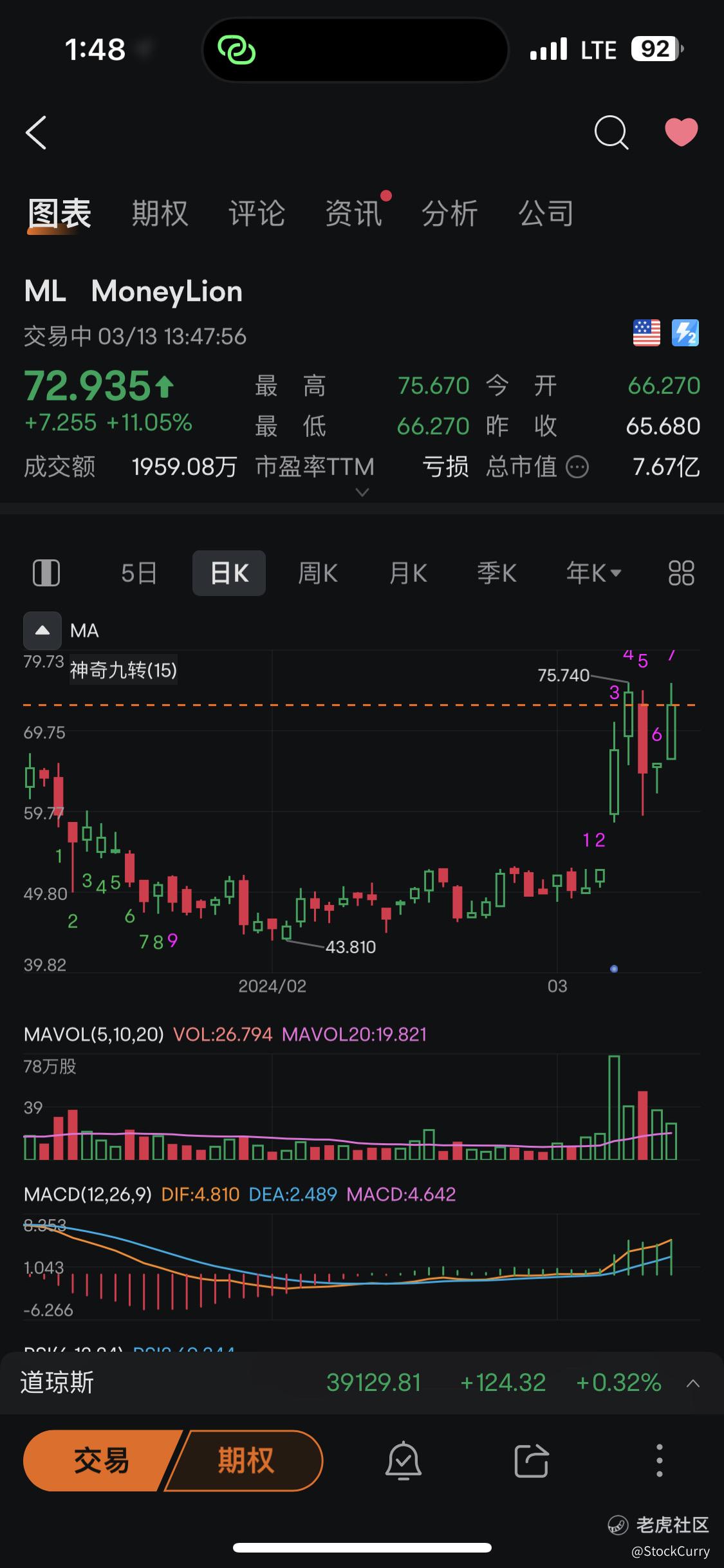 $MoneyLion Inc.(ML)$ 圆弧底 3月7号突破回踩不破经线 非常适合买入 59.25止损