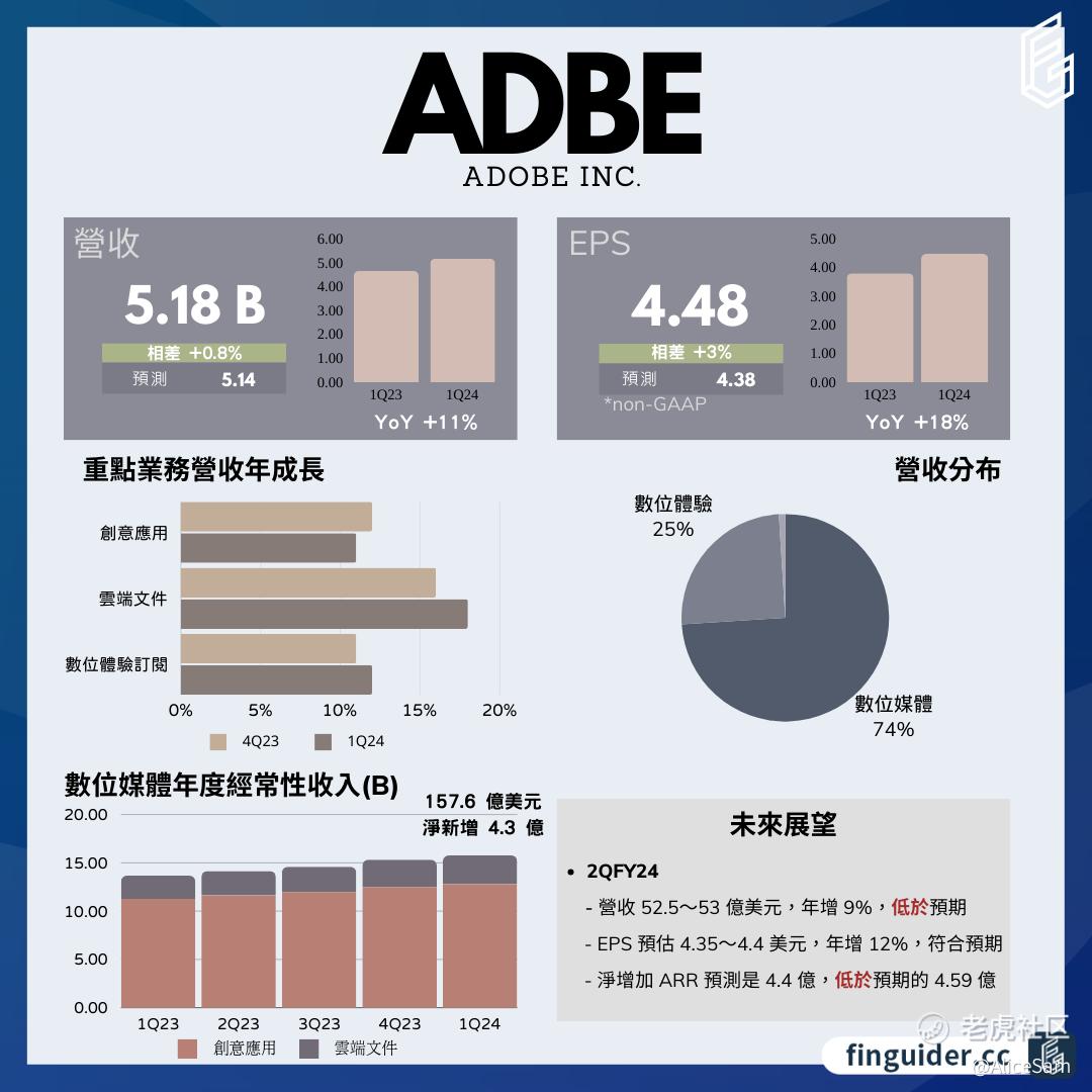 年度经常性收入(ARR)达到157.6亿美元,年增长14%,超出预期。至于获利能力方面,Adobe这个季度的毛利率、营业利益率、净利率跟去年同期相比,都有明显的提升,他们强劲的营运数据显示公司在成本控制、价格调升下,正持续推升Adobe 的利润率,这个季度的季净利年增17%,也是非常不错的业绩👍