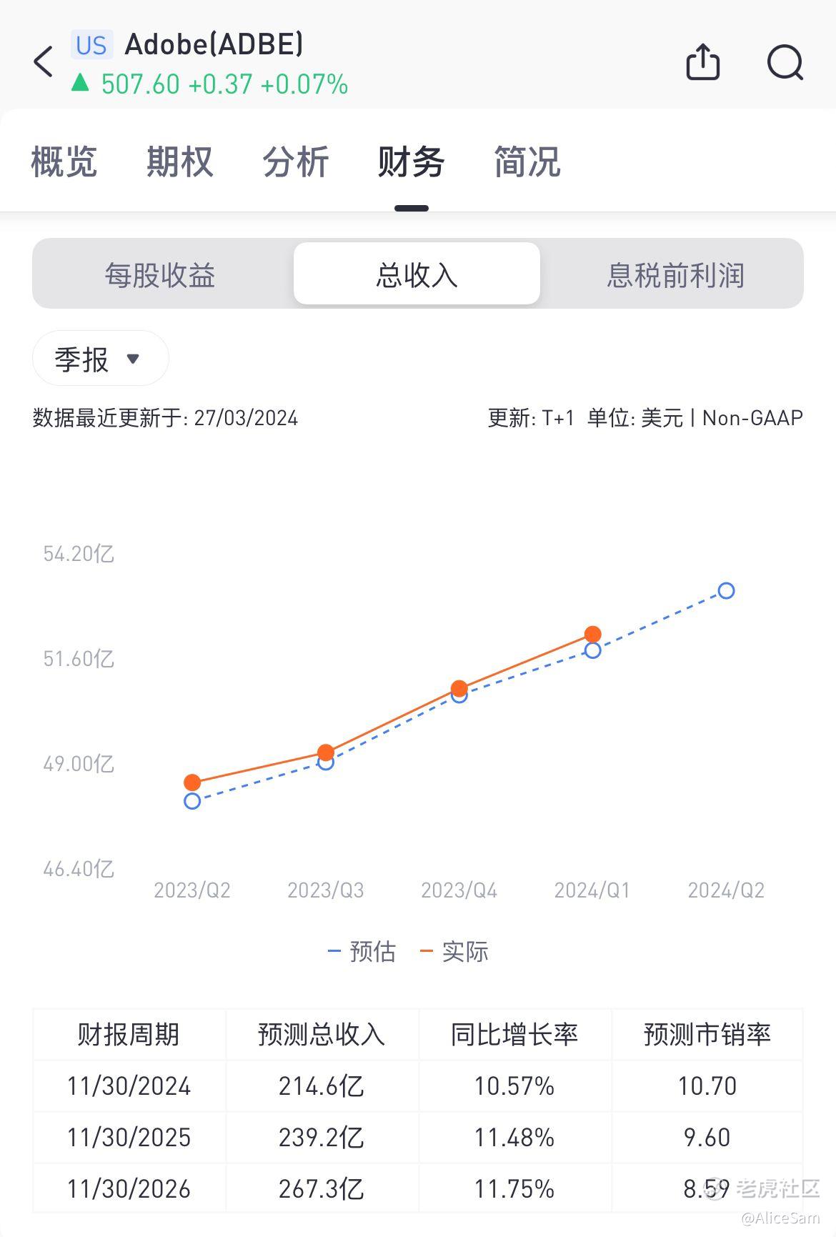 老规矩啦,读财务先读盈利营收表现,Adobe这个财报季的总收入达到51.82亿美元,年增长11%,超过预期数据的51.43亿。看看财务对比图,这是他们连续第四个季度击败预期,并且一直保持着往上发展的趋势,下个季度的预期数据也是保持这个趋势,算得上非常积极的一个业绩展示。👍