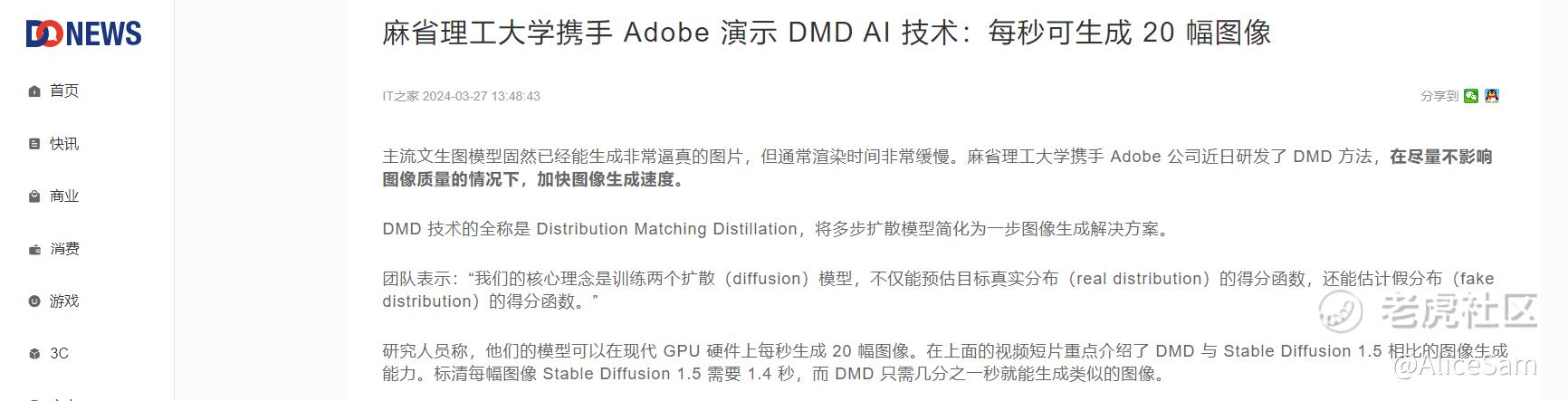 看新闻说麻省理工大学与Adobe 公司达成合作,研发出一项名为 DMD (全称是 Distribution Matching Distillation)的 AI 技术,可以在尽量不影响图像质量的情况下,加快图像生成速度。将多步扩散模型简化为一步图像生成解决方案,并声称,他们的模型可以在现代 GPU 硬件上每秒生成 20 幅图像。这就牛Beer了啊 [哇塞]。