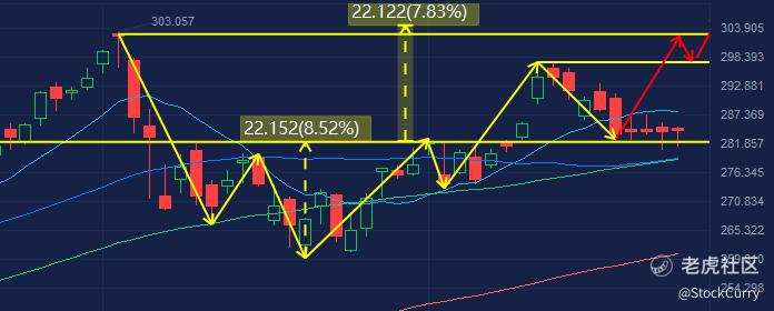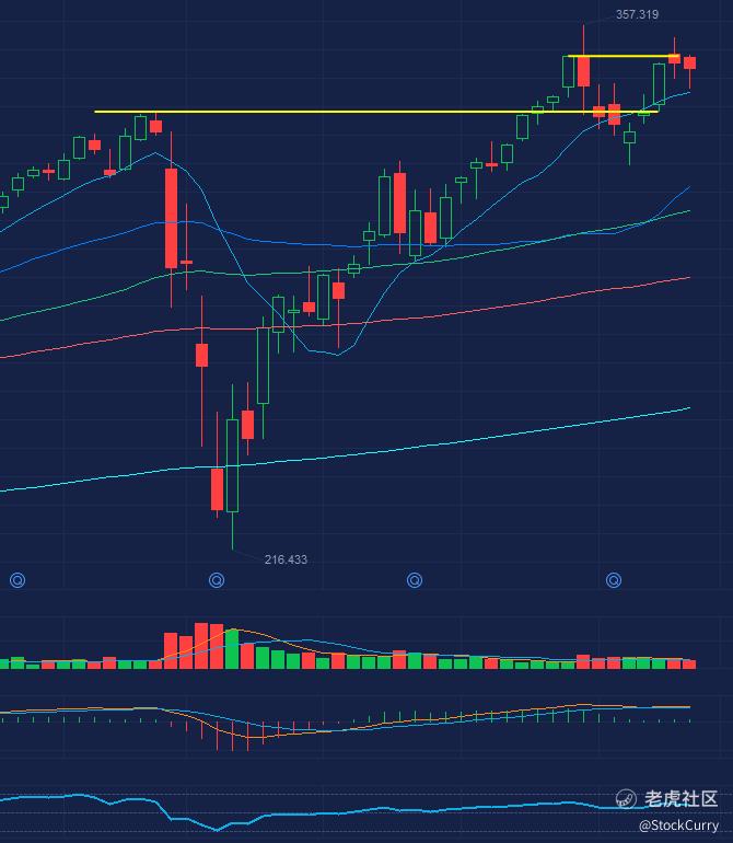 从周线可以看到标普基本调整已经到位,不是没有下跌的可能,但即便下跌也可能幅度有限。日线来看大盘在颈线位置窄幅震荡了四天,下周一很有可能还是这种走势,周二开始可能会选择一定的方向,因为周一盘后谷歌发布财报,周二周三,周四都是重磅财报,股价很可能会受到影响。