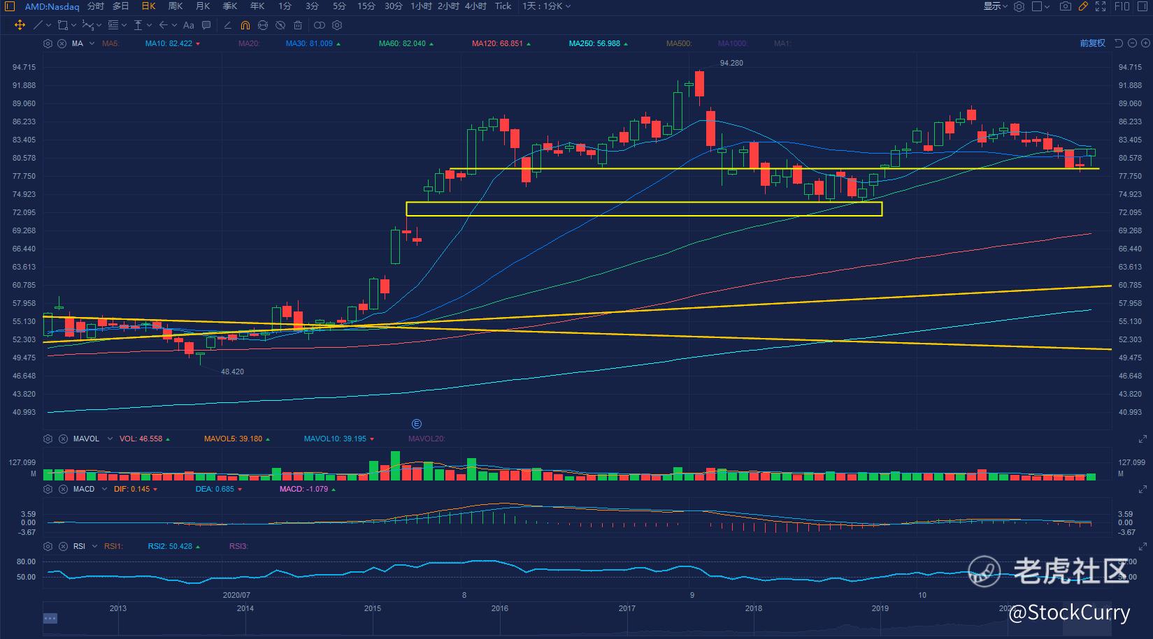 图形方面股价始终在74-86之间震荡,希望这次能借财报向上涨一涨,突破这一区间。