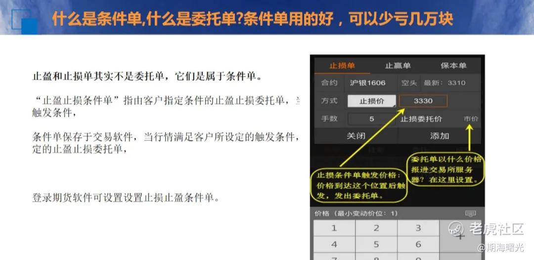 因为很多人去做交易的时候会用到这个手机版的或者软件,那么它里面就会有个止损止盈单,比如说我螺纹,5000价格买进去。那么我现在想亏100元止损,那么我可以设置一个止损单,有时候我们不在电脑面前或者办点事情,就一定要把条件都设置起来,包括我现在做交易有一个习惯,就是说下了单子之后,第一反应下完之后马上设条件单,防止等亏了再去设置,到时人容易侥幸心理,不舍得止损。不少人都等行情亏了,再去问自己该怎么办?所以,一定要做事前准备,而不是事后在做。