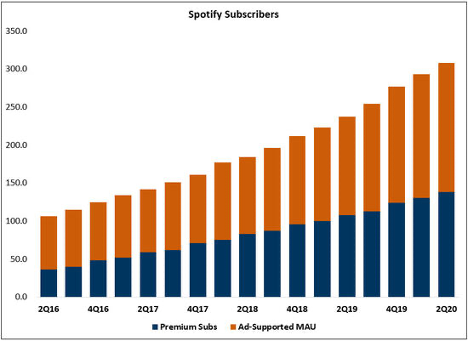 自成立以来,Spotify的吸引力远超投资者的想象。截至2020第三季度末,该公司共拥有1.44亿付费高级用户,同比增长近27%;以及1.85亿的普通月活用户,同比增长31%。值得注意的是,即使用户没有订阅高级会员服务,Spotify也可以通过在用户播放音乐时插入广告,从而获取收入。如下所示,过去四年中,用户数量翻了几番,从1亿增至3亿左右。