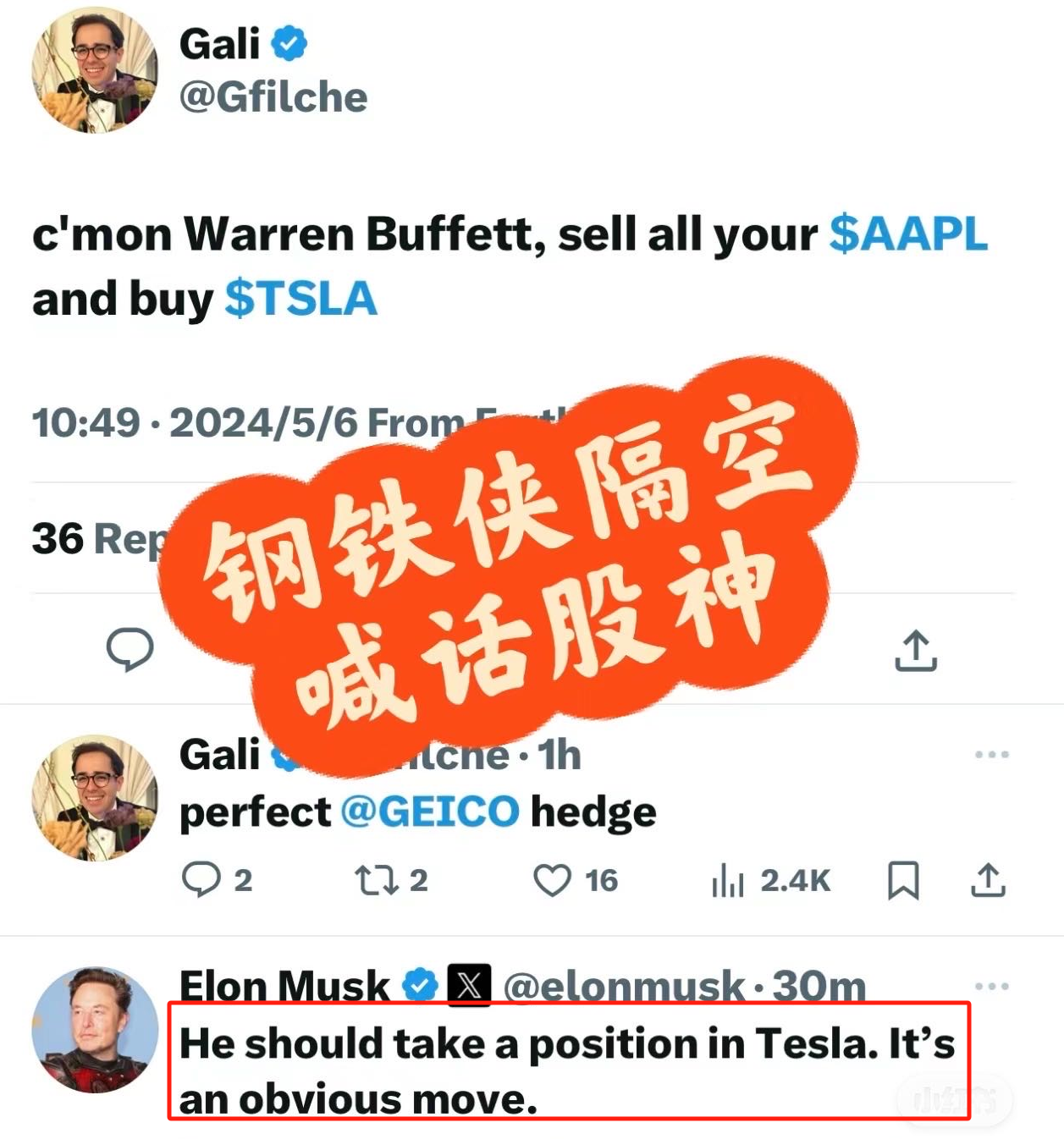 原贴是某人在社交平台上“建议”股神出售苹果股份,转而买特斯拉。马斯克积极回复该网友,称巴菲特是应该买,这么明显的投资机会。[暗中观察]