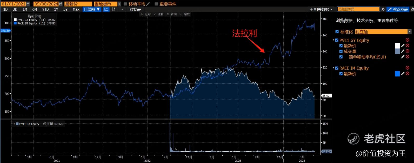 因此,即使法拉利昨日股价大跌,2024年的涨幅依然达到18.5%,而保时捷只有6.4%,拉长时间看,两家公司的股价走势更是南辕北辙: $Porsche Automobile Holding SE(POAHY)$