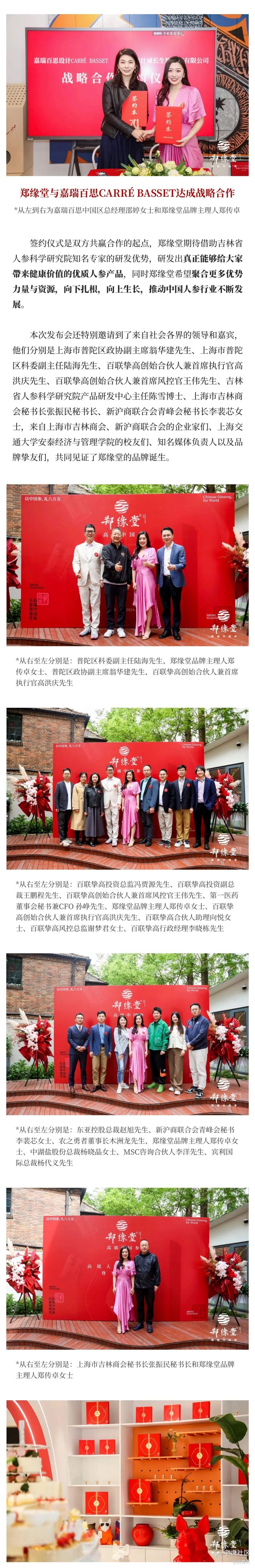 2024年4月19日,「郑缘堂ZHENGYUANTANG 高端中国参」2024年度品牌发布会于上海成功落幕。「郑缘堂ZHENGYUANTANG」源自百年人参世家郑氏家族,致力于打造中国现代派高端人参品牌。