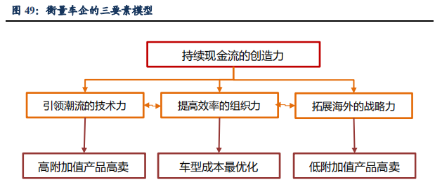 对于新能源汽车企业能否实现实质突破,东吴证券在2020年11月制作了一个三要素模型——引领潮流的技术力、提高效率的组织力、拓展海外的战略力共同作用,代表着企业能具备持续现金流的创造力,从而形成机会-人才-技术-产品四大牵引力之间形成的良性循环。