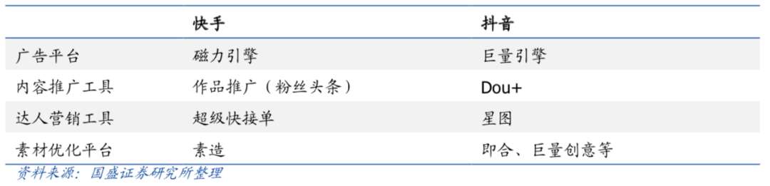在变现端,快手为广告主提供了完善的广告产品体系,包括内容推广工具“作品推广”、达人营销工具“超级快接单”、素材优化平台“素造”等,分别对标抖音的“Dou+”、 “星图”、“巨量创意”等。