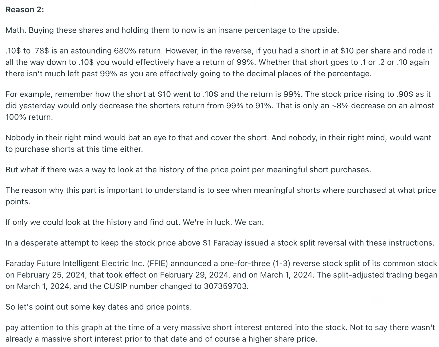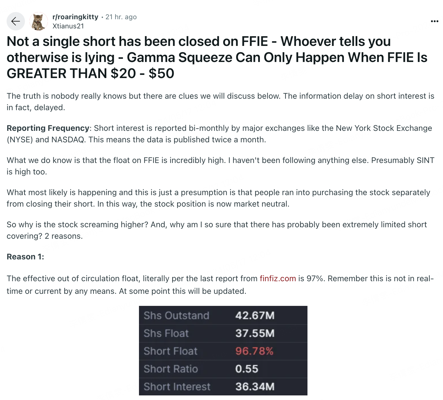 刚去WSB看了篇长文分析 $Faraday Future(FFIE)$ 是否到头了?空头出完货了嘛?我先说结论 roaringkitty 认为现在空头还没平仓,如果想轧空,至少得把FFIE股价拉到20-50美元。