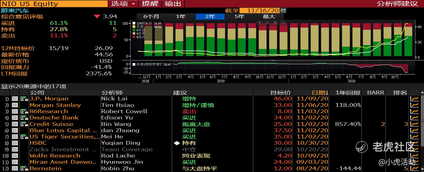 大约一个月前(10月14日),摩根大通另一位分析师Nick Lai发布报告,给予蔚来汽车增持评级,目标价由14美元大幅上调至40美元。随后,大摩、德银等大行跟进,分别上调蔚来目标价至33美元、34美元。近期摩根大通再次提升蔚来汽车目标价从41美元上调至46美元,评级为「增持」。分析师表示,预计蔚来到2025年将享有30%的市占率,将成为高端电动汽车领域的长期赢家。