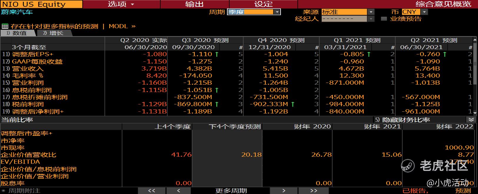她还表示,蔚来正在引领中国智能电动汽车的商业模式转型,面向潜在B端和C端客户的直销模式正向通过平台和内容提供服务的商业模式转型,因此给予它更高的估值是合理的。预计蔚来到2025年将享有30%的市占率,将成为高端电动汽车领域的长期赢家。她还表示,蔚来正在引领中国智能电动汽车的商业模式转型,面向潜在B端和C端客户的直销模式正向通过平台和内容提供服务的商业模式转型,因此给予它更高的估值是合理的。对于3季度的财报预期如下,彭博分析师预计2020年3季度营收为43.82亿元,调整后EPS为-1.11,2020年4季度营收为54.15亿元。